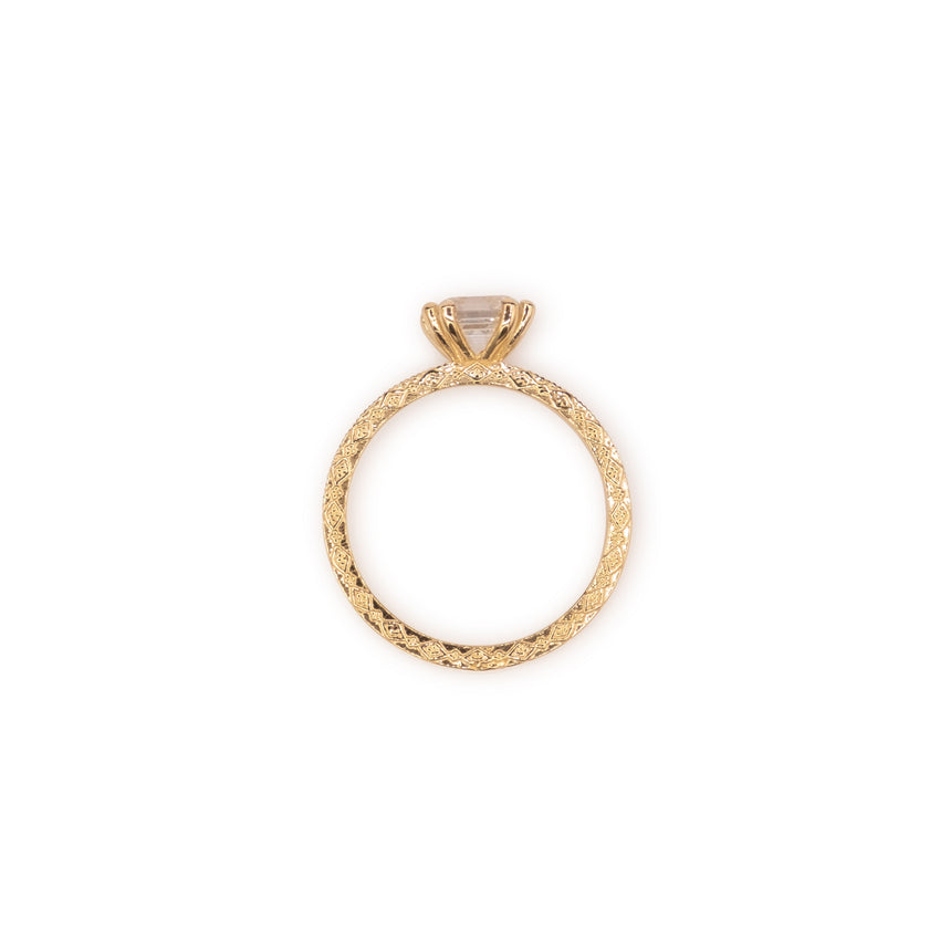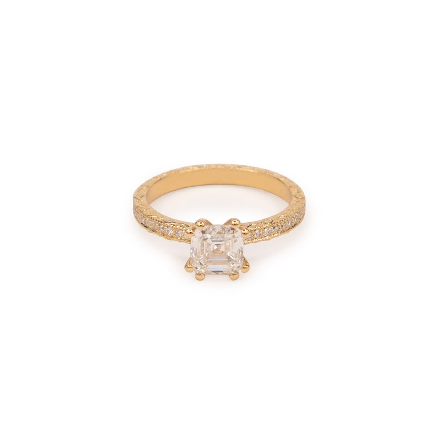 The 1ct Asher cut exudes a breathtaking allure with its sleek lines. Enhanced with white small diamonds, meticulously set along the ring band and showcasing our distinctive vintage finish. It's an enduring masterpiece that effortlessly captivates hearts.