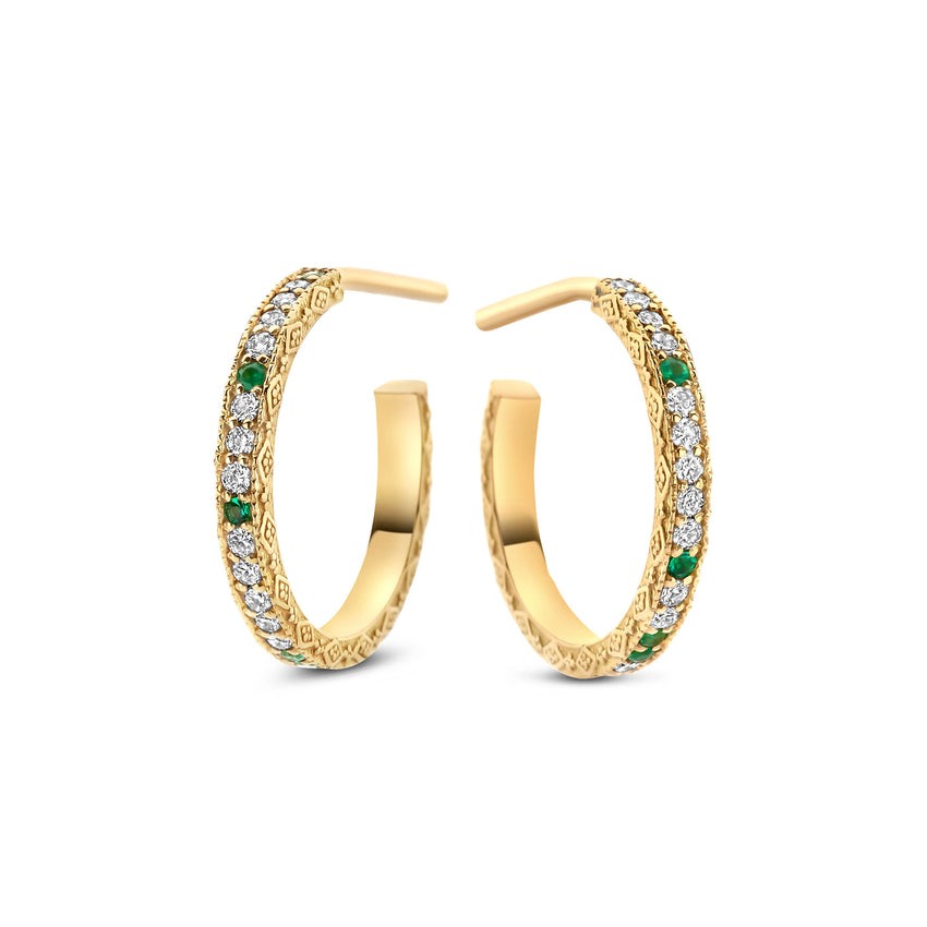 The Giulia Earrings - inspired by the design of one of our signature rings, these earrings feature emeralds and diamonds arranged in a refined structure. They also include our signature Art Deco engraving on the side for added detail. A standout pair with a timeless edge.