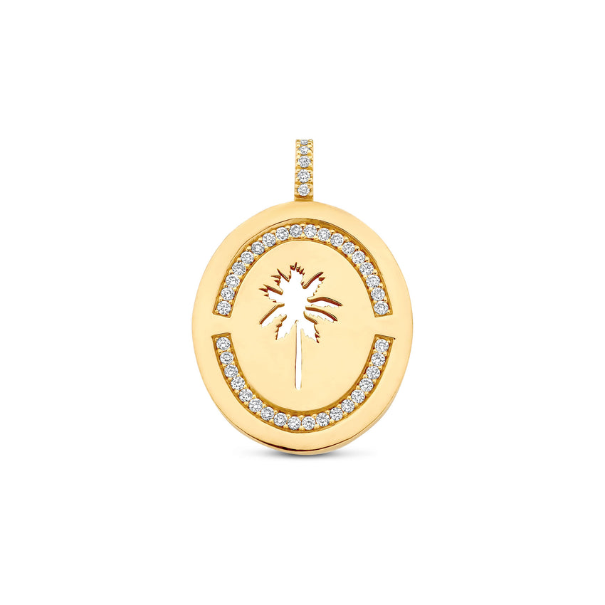 The Palm Tree Bellière Charm - this oval medallion charm features a palm tree cut-out at its center, allowing light to pass through the design. Diamonds are set into the bail and in two curved lines on the charm itself for a refined finish. A meaningful, elegant piece that brings together structure, sparkle, and a subtle nod to the brand's identity.