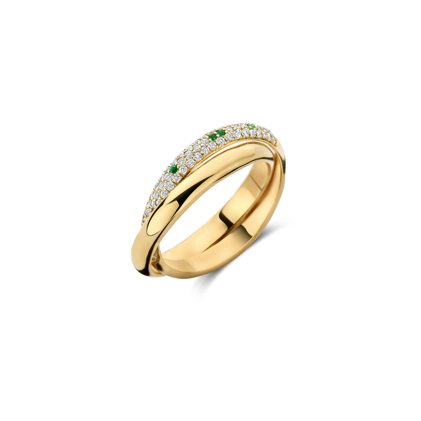 The Riva Ring is a modern two-in-one ring that combines structure, contrast, and refined sparkle. Designed as a double band composition, it features one polished gold band paired with a second band set with vivid emeralds and lab-grown diamonds.