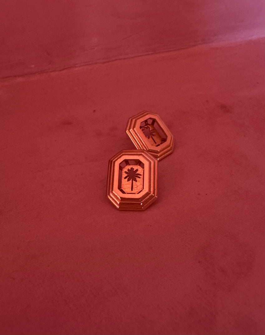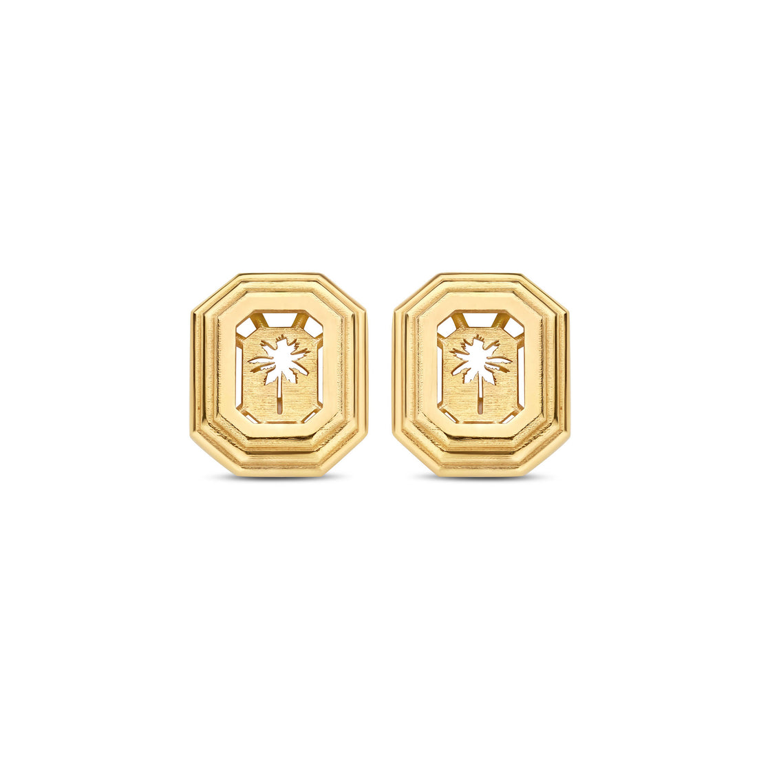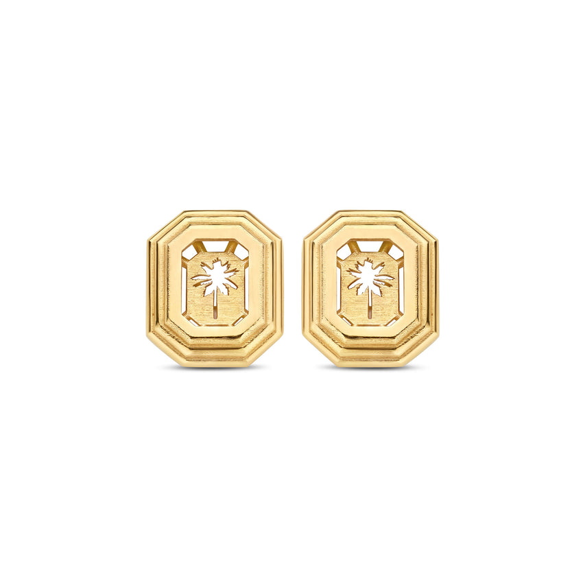 Subtly cut out with a delicate palm tree motif, these gold earrings carry a quiet signature detail that adds depth and character to their minimalist form. The engraving brings a distinctive touch while maintaining the sleek, architectural aesthetic.