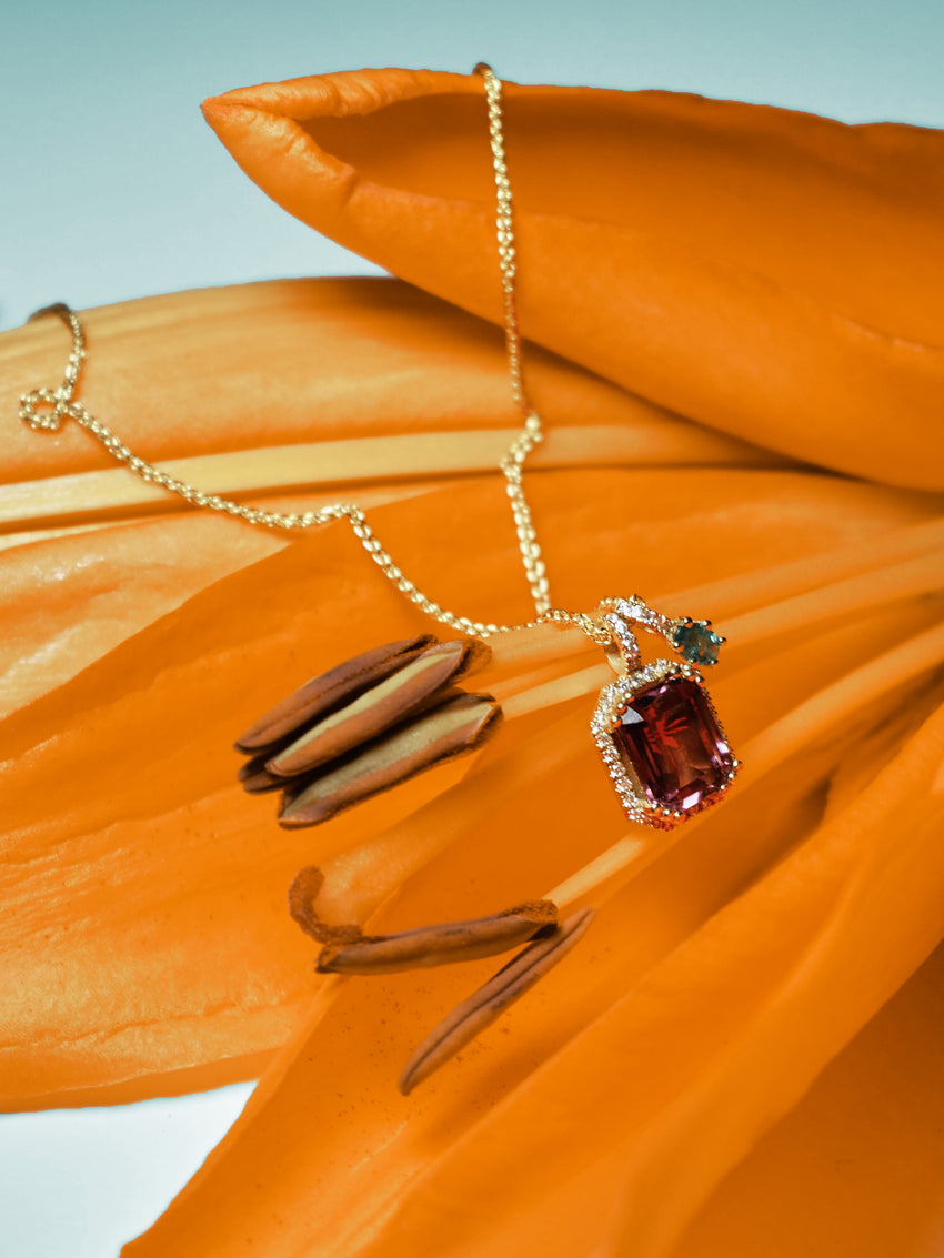 For those who wish to recreate its beauty, we offer the possibility to have the Rosalie Charm custom made to measure, set with a stone in a similar shade or a gemstone of your own choosing. This bespoke option allows you to create a personalised gold pendant that reflects your individual style.